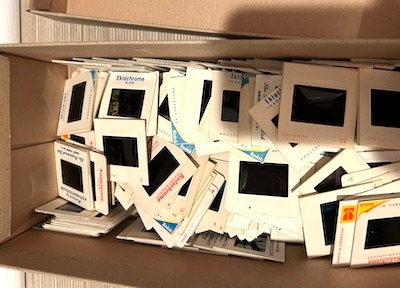 While searching the cabinets, I found several unfilled photo albums that have been kicking around for decades and boxes slides in various states of organization. I tried to convince her to donate 4 of the 8 empty photo albums and put them by the garage door. I am sure they’ll be back in the cabinet after I leave. I tried.